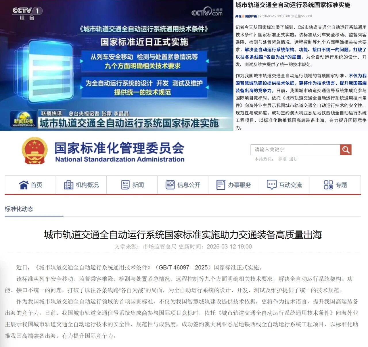 近日,央视新闻和国家标准化管理委员会报道,我国城市轨道交通信号系统集成商在参与国际项目竞标时,依托新实施的国家标准向海外业主展示了中国全自动运行技术的安全性、规范性与成熟度,并成功签约澳大利亚悉尼地铁西线全自动运行系统工程项目。
